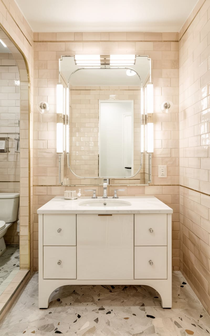 Soft, rosy hues and charming, retro touches create a warm and inviting atmosphere in this Art Deco-inspired bathroom. Square, pale pink tiles with a subtle texture clad the walls, with a delightful scalloped edge detail above the wainscoting. A simple, wall-mounted pink sink and a toilet are complemented by brass fixtures. A large, frameless mirror with a reeded glass privacy panel for the shower is accented by a delicate gold frame. The terrazzo floor, speckled with warm-toned chips, adds a touch of vintage charm.