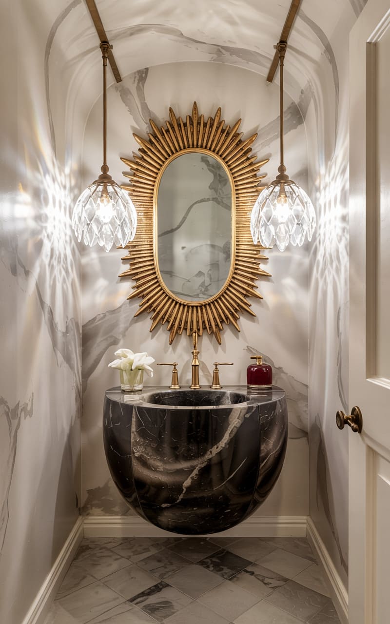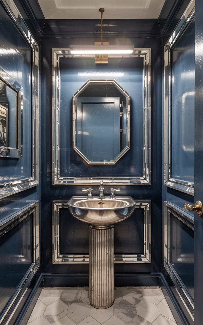 173. Deco Powder Room with Sapphire Walls and Sunburst Mirror