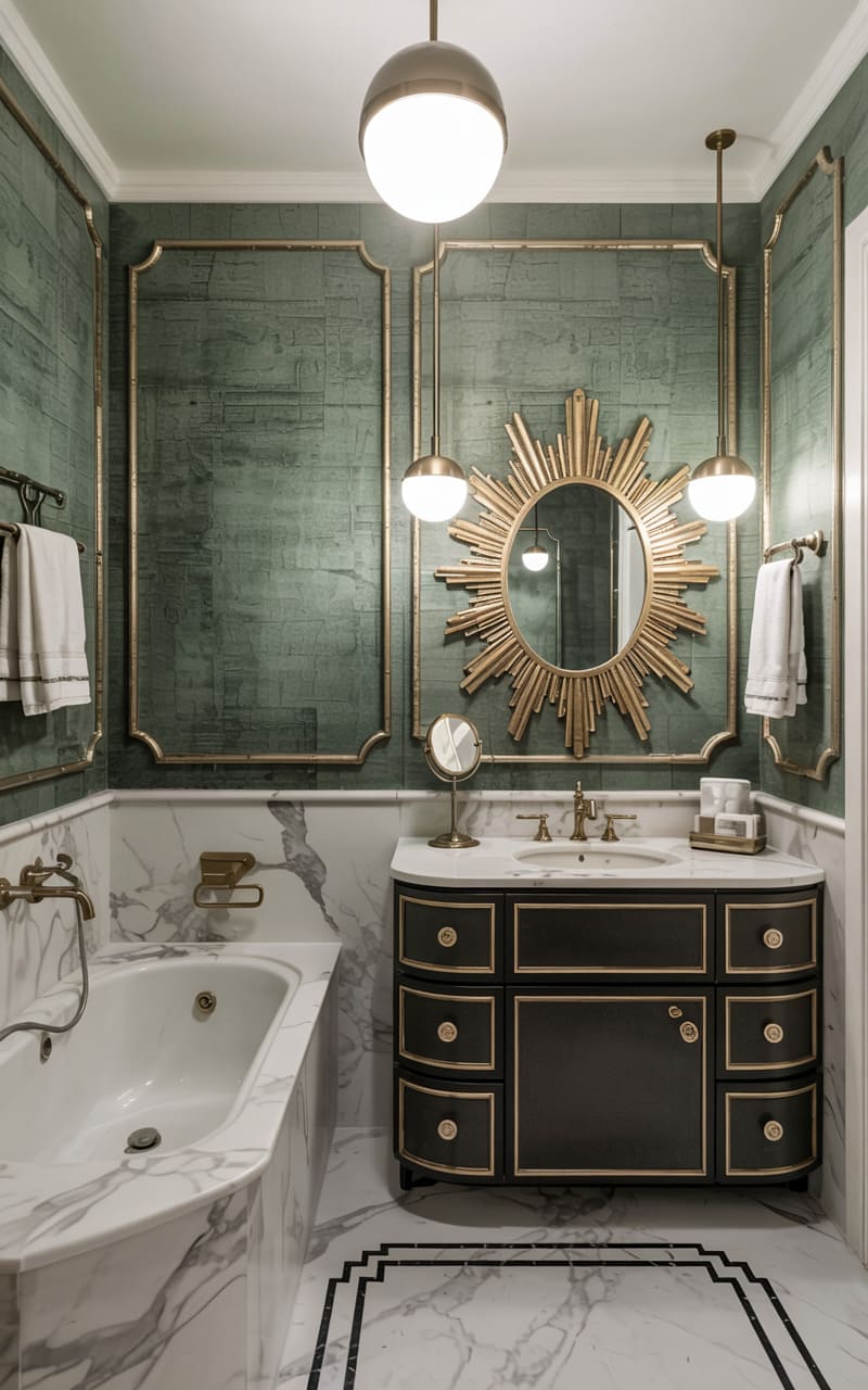 180. Bathroom with Celadon Green Accents and Deco Arch Niches