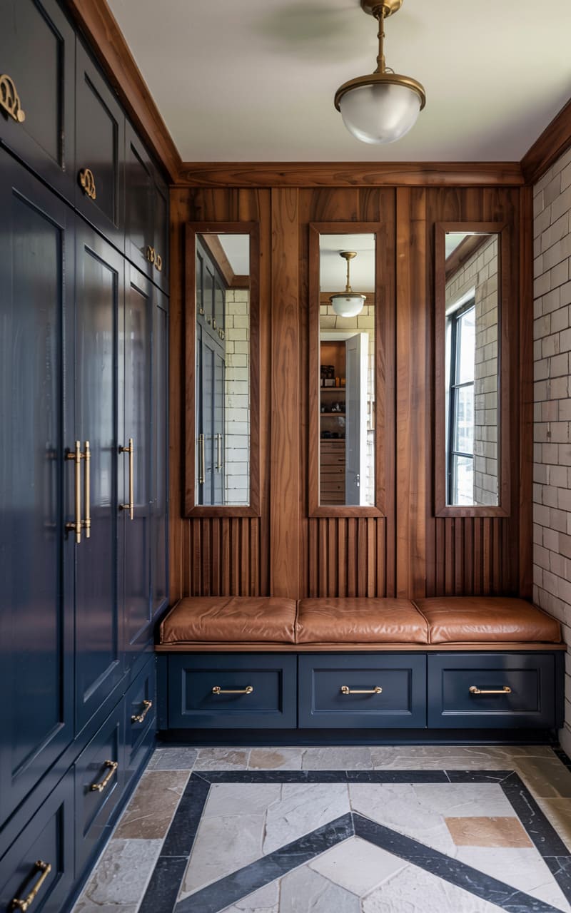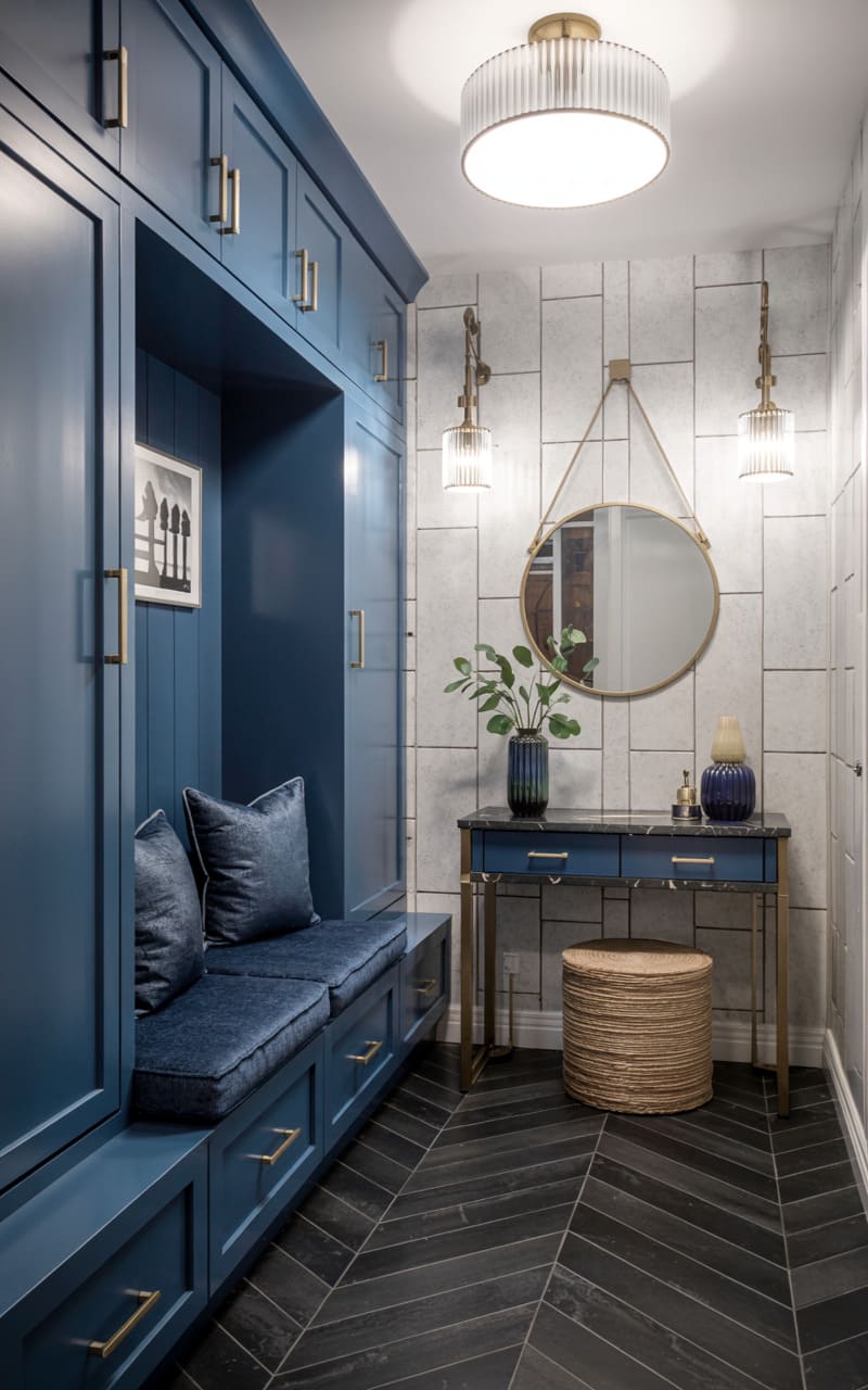 A sophisticated and functional mudroom combines classic Art Deco elements with a rich color palette. Tall, dark blue, shaker-style cabinetry with elegant brass hardware provides ample storage, including a built-in bench with plush, blue velvet cushions. A console table with a dark marble top and brass frame sits against a wall of light grey, textured tiles. A round mirror with a hanging strap and two elegant, crystal wall sconces add a touch of glamour. The dark, herringbone-patterned tile floor completes this stylish and well-organized transitional space.