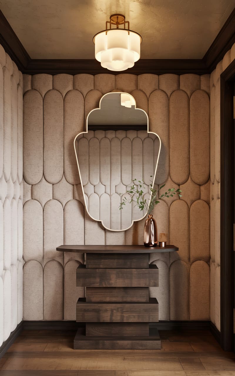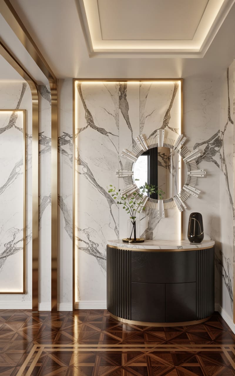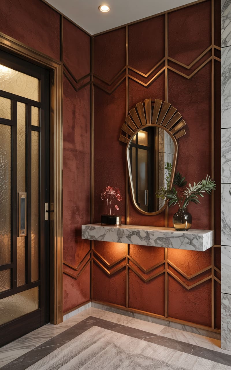 A dramatic and inviting atmosphere is created in this Art Deco entryway by the use of rich color and bold geometric patterns. Walls are clad in a textured, deep terracotta material, accented by a striking, angular zigzag pattern in gleaming gold trim that extends onto the illuminated underside of a floating white marble console shelf. A uniquely shaped mirror with a gold sunburst frame hangs above. A glimpse of a dark, patterned door and a subtly patterned floor completes this opulent and welcoming first impression.
