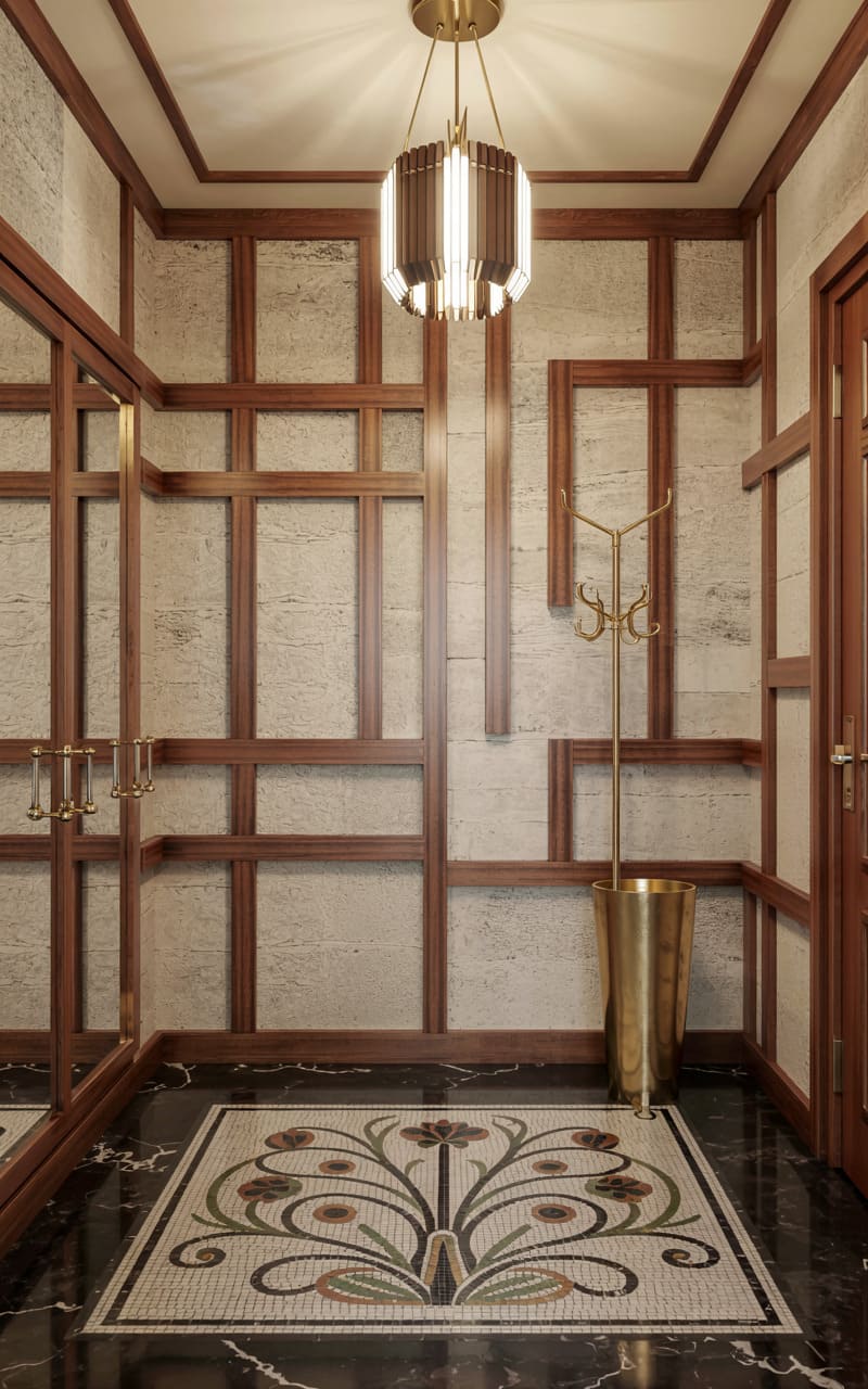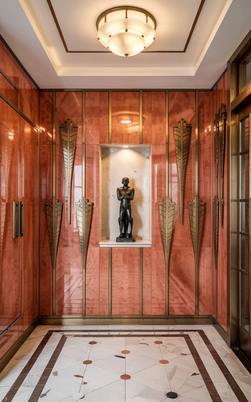 184. Foyer with Coral Lacquer Paneling and Brass Art Deco Motifs