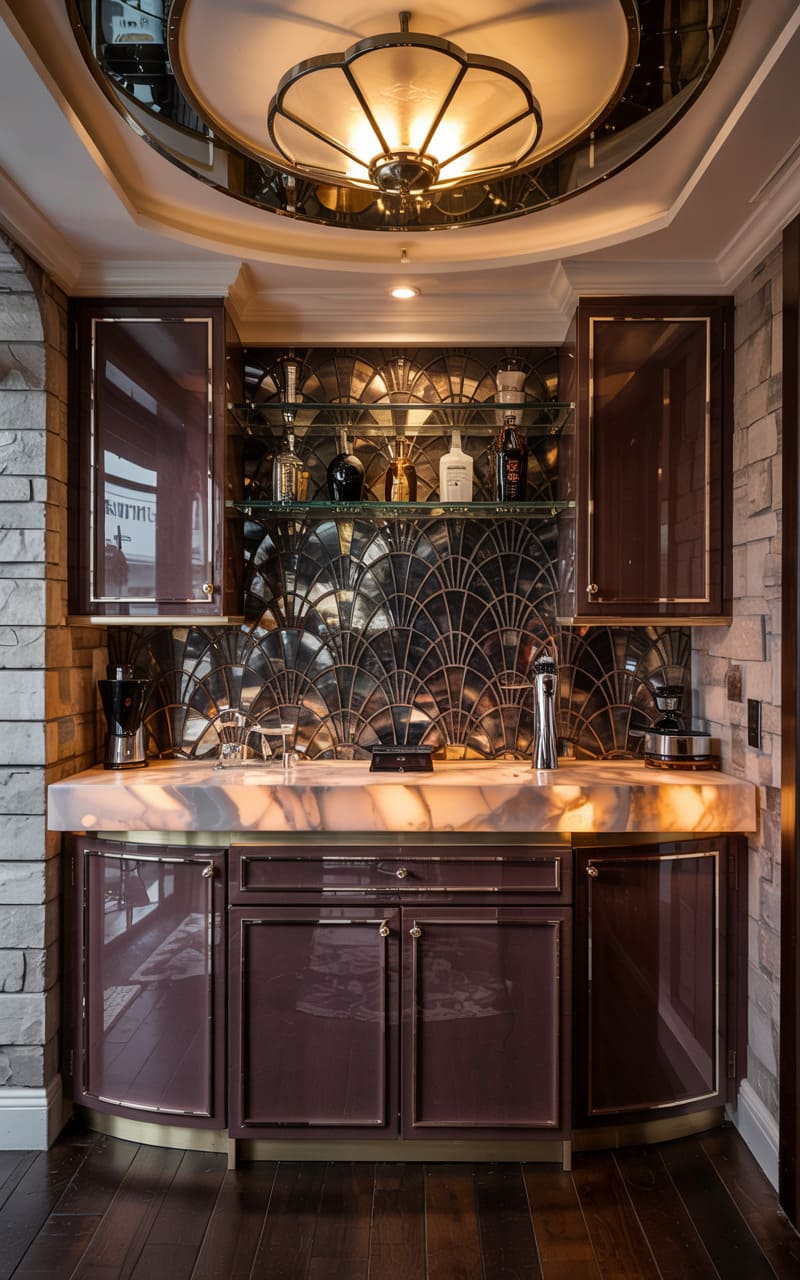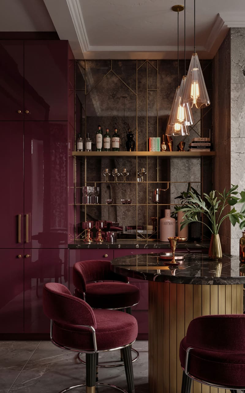 A bold and glamorous home bar combines rich jewel tones with striking Art Deco details. High-gloss, deep plum lacquered cabinetry provides ample storage. Mirrored shelving, framed by delicate gold geometric openwork, displays a collection of spirits and glassware against a textured, dark grey stone backsplash. Two plush bar stools, upholstered in deep plum velvet with elegant gold frames, offer stylish seating at a curved, black marble-topped bar with a ribbed gold base. Delicate, multi-light pendant fixtures cast a warm, inviting glow.