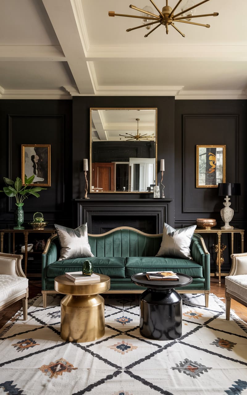 A bold and dramatic interplay of black and green defines this sophisticated Art Deco living room. Black paneled walls create a moody backdrop for a vibrant green velvet sofa with classic lines, accented with shimmering silver pillows. Two elegant, light-colored armchairs provide contrasting seating. A square, mirrored coffee table sits at the center, flanked by a sculptural gold side table and a black drum-shaped table. A striking, patterned rug in black, white, and beige with geometric motifs grounds the seating area. A large, simple mirror hangs above the black fireplace.