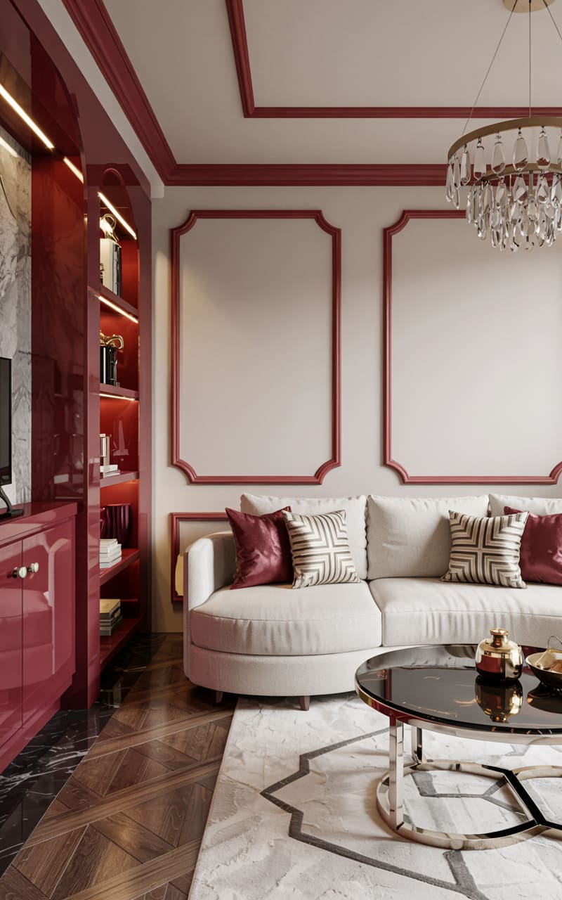 153. Deco Living Room with Burgundy and Cream Contrast and Lacquered Furniture
