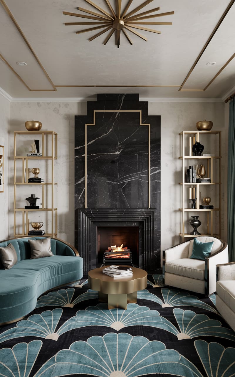 A dramatic, black marble fireplace with striking white veining, designed in a stepped, geometric Art Deco style, commands attention in this sophisticated living room. It is flanked by tall, open shelving units in a warm brass finish, displaying books and curated objets d’art. A gracefully curved sofa in teal velvet and two contrasting white armchairs offer luxurious seating around a round, brass coffee table. A magnificent, golden sputnik chandelier hangs from the ceiling. The circular rug features a bold, stylized fan motif in black, teal, and cream.