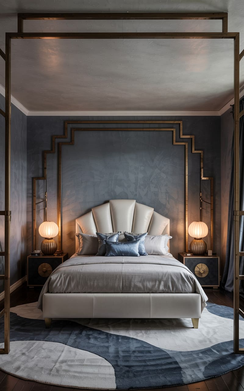 Serene elegance and a focus on subtle, luxurious details characterize this Art Deco bedroom. A cream-colored, leather-upholstered bed with a gently curved, shell-like headboard creates a tranquil focal point. The wall behind is a textured, muted blue-grey, framed by an elaborate, geometric gold metallic structure that extends to form a canopy-like effect. Two unique, spherical lamps with a warm, diffused glow sit on dark, circular nightstands. A circular rug with an abstract, wave-like pattern in blues and creams grounds the space.