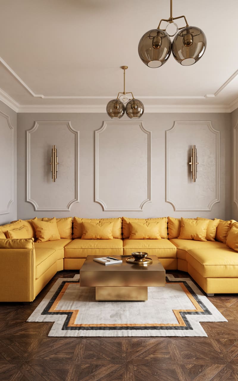 Vibrant yellow and warm brass create an unexpectedly cheerful and sophisticated Art Deco living room. A large, L-shaped sectional sofa, upholstered in a sunny yellow fabric, offers ample, inviting seating. A substantial, square coffee table in a brushed brass finish sits at the center. The walls feature classic panel molding in a soft, neutral hue, accented by elegant, tiered brass wall sconces. The dark, parquet-patterned wood floor provides a rich contrast. A patterned rug with geometric motifs in cream, yellow, and grey grounds the seating area.