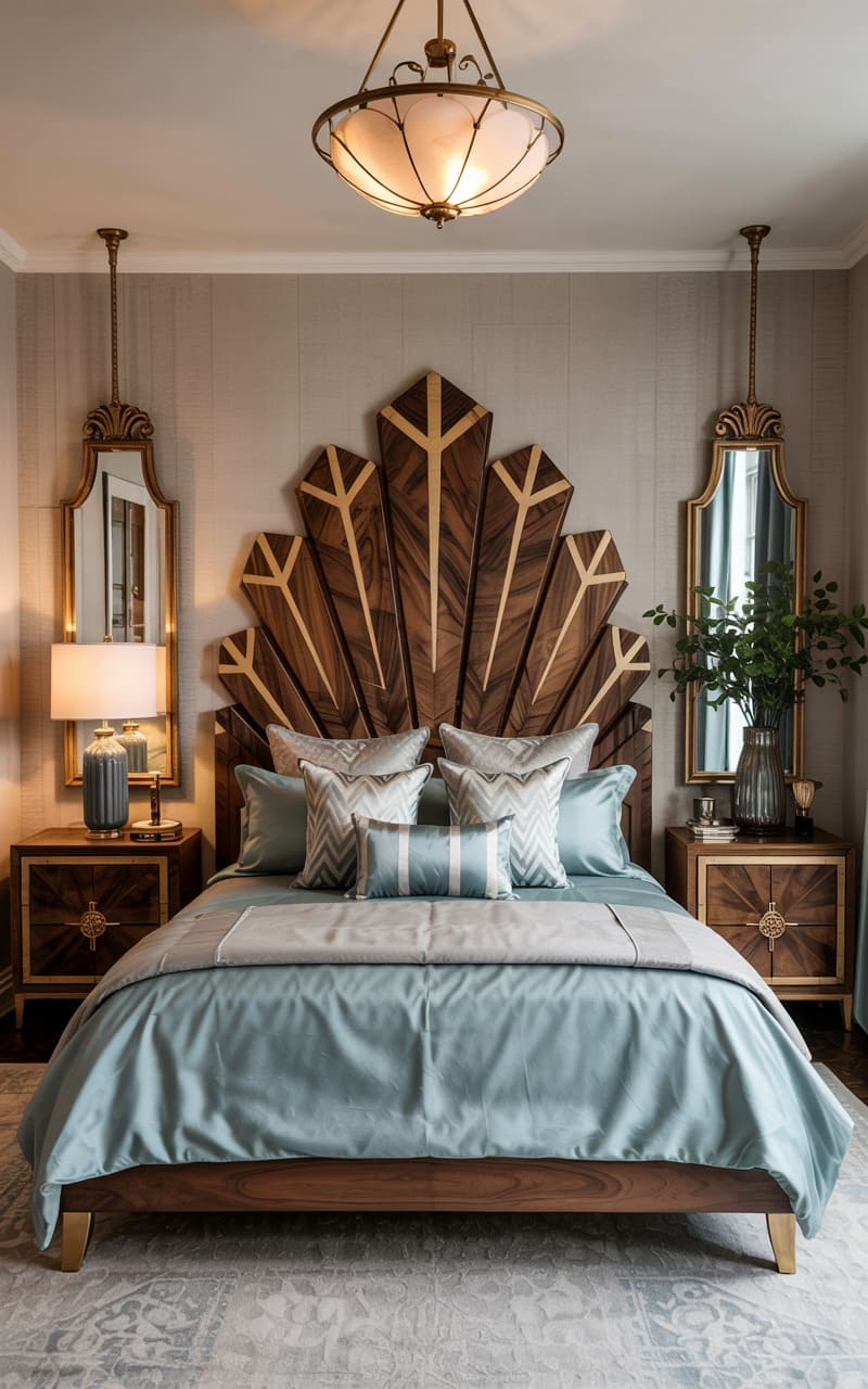 A masterpiece of woodcraft and refined elegance, this Art Deco bedroom features a striking headboard composed of radiating, fan-like segments of rich walnut wood. The bed is dressed in crisp white linens and shimmering satin bedding in pale blue and silver. Dark wood nightstands, inlaid with a geometric sunburst motif, hold elegant table lamps. Two ornate, gold-framed mirrors with a distinctly Deco silhouette hang on either side of the bed. A subtly patterned, light-colored rug adds a final touch of sophisticated comfort.