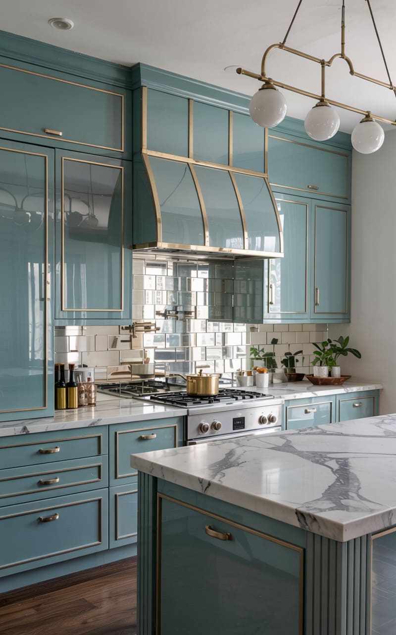 Cool, glossy teal and gleaming metallic accents define this chic Art Deco kitchen. High-gloss teal cabinetry with delicate gold trim lines the walls, its smooth surfaces reflecting light. A mirrored subway tile backsplash adds a touch of glamour and amplifies the space. White marble countertops provide a luxurious work surface. A large island, also in teal with a marble waterfall countertop, serves as a central hub. A modern, multi-globe pendant light in white and brass hangs above, casting a warm glow.