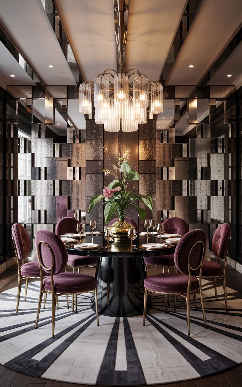 A dramatic and opulent atmosphere pervades this Art Deco dining room, where deep plum velvet and shimmering, textured metallic surfaces converge. Chairs upholstered in rich plum velvet with elegant gold frames surround a circular, black lacquered table. The walls are lined with faceted, metallic panels that catch and reflect the light from a magnificent, multi-tiered crystal chandelier. A circular rug with a bold, radiating black and white striped pattern grounds the space, creating a truly glamorous and unforgettable dining experience.