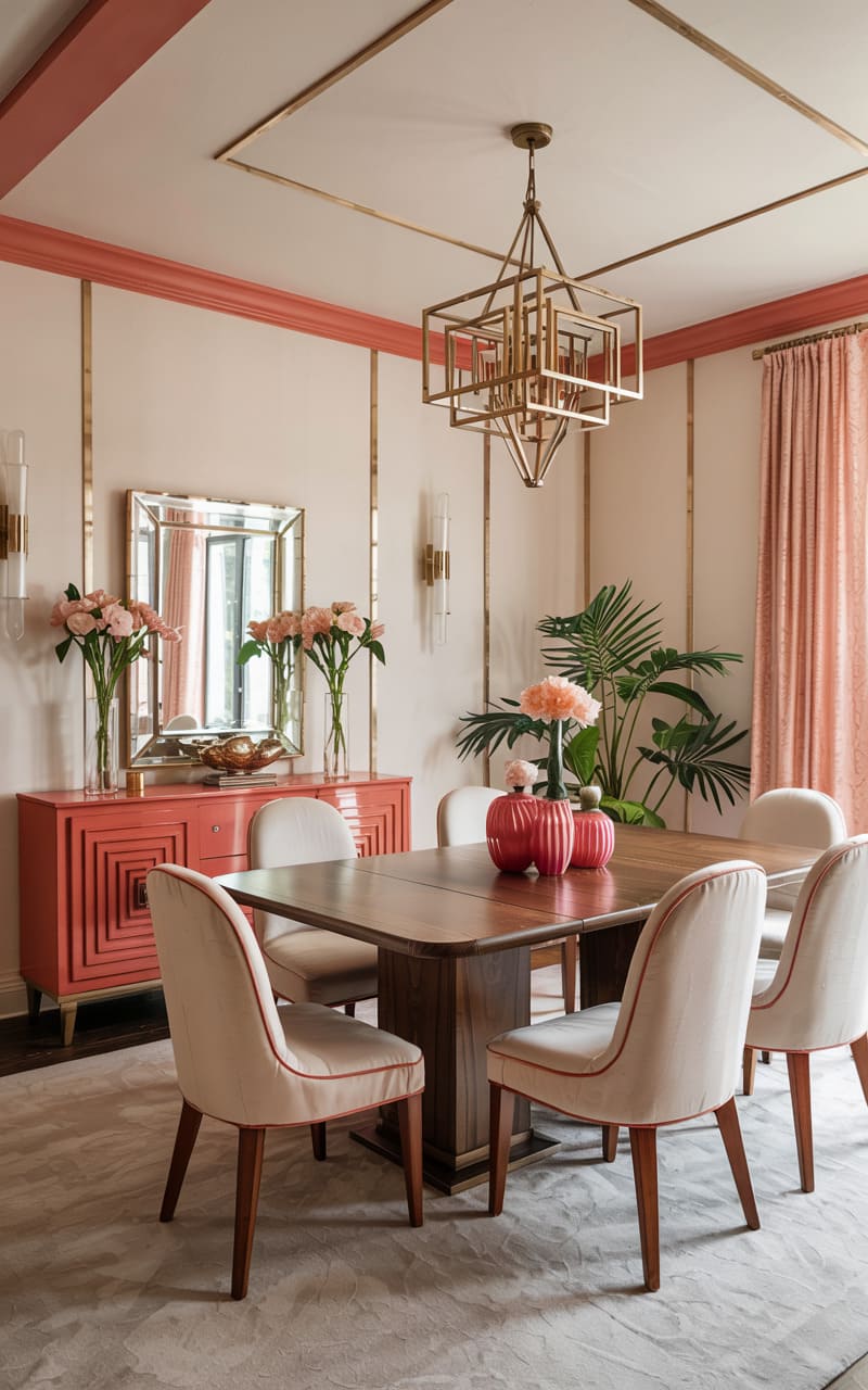 Soft coral pink and warm wood create an inviting and stylish Art Deco dining room. Chairs upholstered in a light, neutral fabric with coral piping surround a substantial wooden table. A coral-colored credenza with a ribbed front and geometric detailing displays decorative vases and floral arrangements. The walls feature simple paneling in a creamy off-white, accented with gold trim and elegant wall sconces. A large potted plant adds a touch of nature. The light-colored, subtly patterned rug enhances the room’s warm and welcoming ambiance.