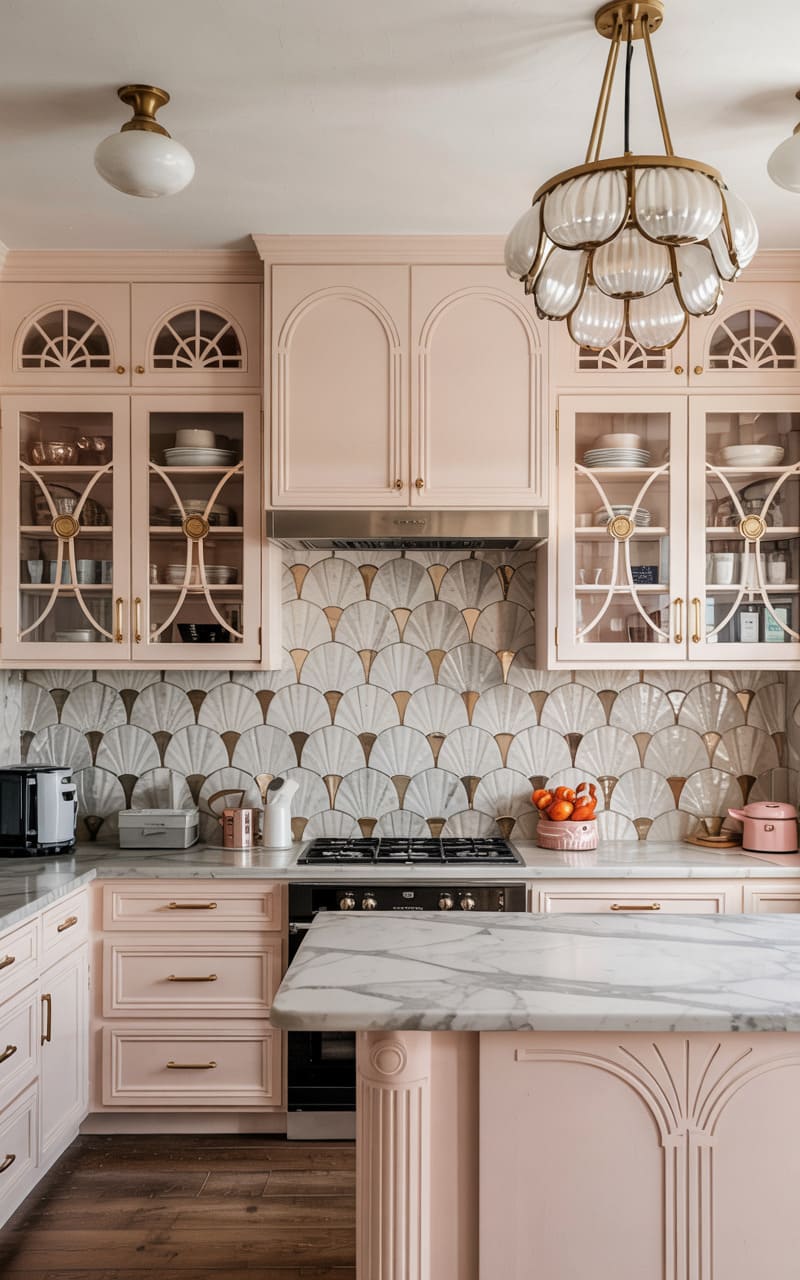 Charming, feminine, and exquisitely detailed, this Art Deco kitchen features pale pink cabinetry with arched, reeded glass upper doors showcasing a collection of white dishware. The backsplash is a stunning mosaic of stylized fan or shell-shaped tiles in white and gold. A white marble-topped island with fluted detailing provides a central workspace. A magnificent, multi-tiered chandelier with frosted glass elements, reminiscent of a blooming flower, casts a warm, inviting glow. The dark wood floor provides a grounding contrast.