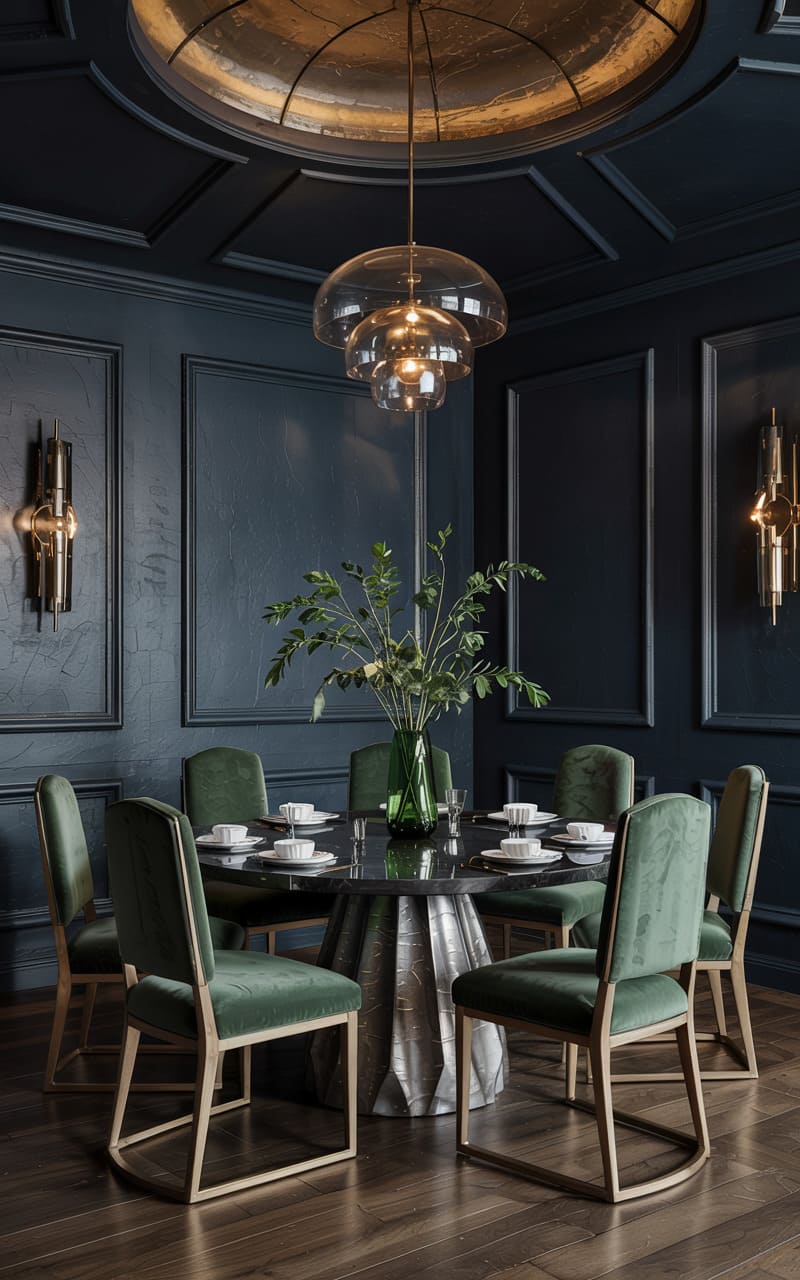 Deep, moody tones and sophisticated lighting create an intimate atmosphere in this Art Deco dining room. Chairs upholstered in rich forest green velvet with slender gold frames surround a circular, dark marble-topped table with a sculptural, metallic base. The walls are a dark, textured blue-grey with classic panel molding. A striking, multi-tiered smoked glass pendant light hangs above the table, casting a warm, diffused glow. Elegant wall sconces provide additional ambient illumination. The dark wood floor enhances the room’s rich, enveloping quality.