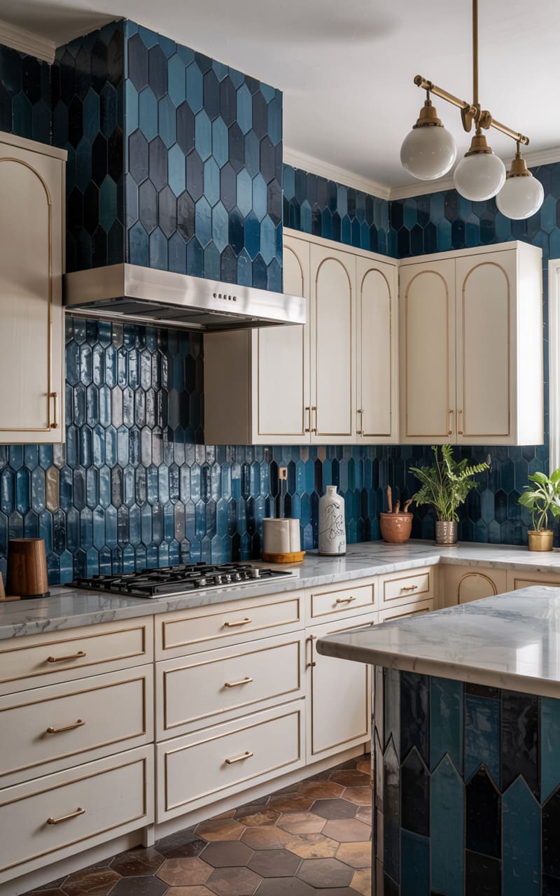 A vibrant and playful use of color and pattern defines this Art Deco-inspired kitchen. Elongated, hexagonal tiles in varying shades of deep blue create a striking, full-height backsplash and cover the island base. Cream-colored, flat-panel cabinetry with simple gold hardware provides a clean contrast. White marble countertops offer a luxurious work surface. Hexagonal terracotta-colored floor tiles add another layer of geometric interest. A modern, multi-globe pendant light in white and brass hangs above the island.