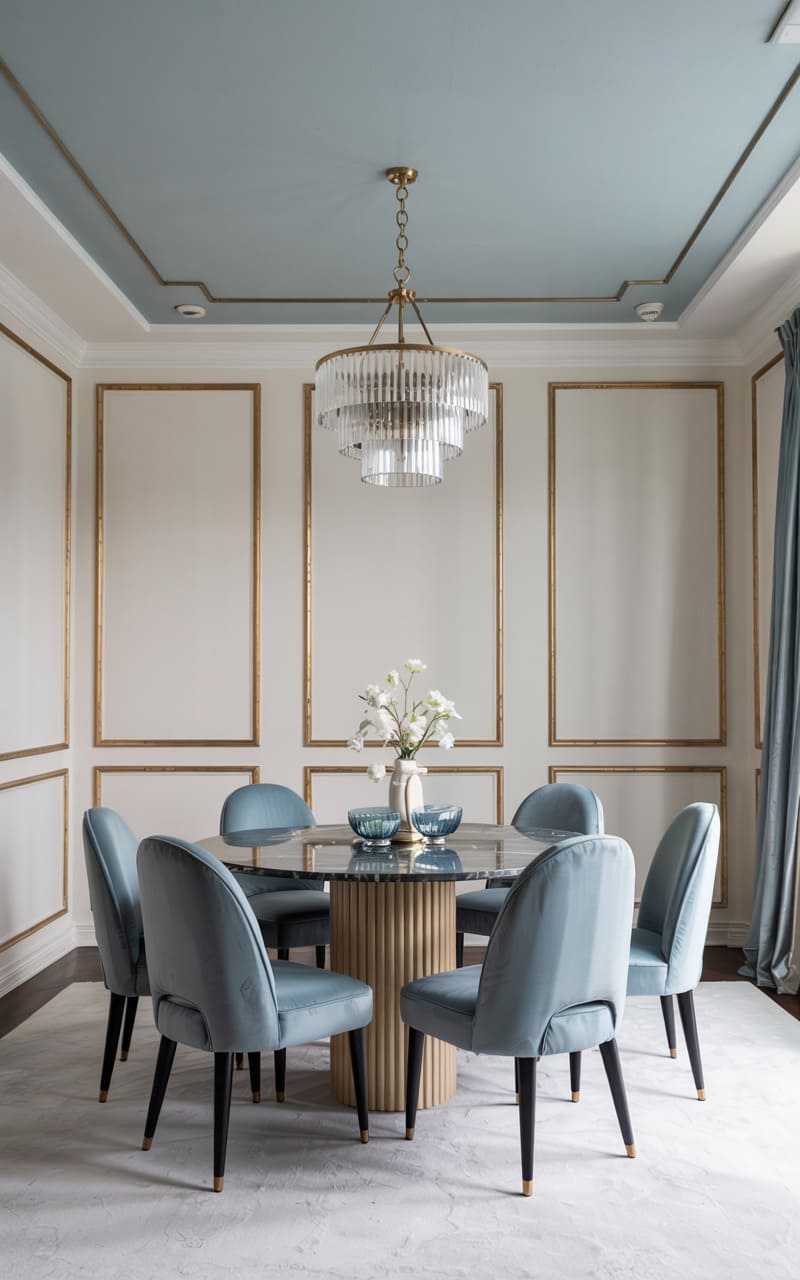 Serene blues and classic Art Deco elegance define this sophisticated dining room. Chairs upholstered in pale blue velvet with dark legs surround a circular, dark marble-topped table with a fluted, light wood base. The walls feature simple panel molding in a creamy off-white, accented with gold trim. The ceiling is painted a soft blue, also with gold trim. A magnificent, multi-tiered crystal chandelier hangs above, casting a sparkling glow. A light-colored rug grounds the space, creating an atmosphere of calm, refined luxury.
