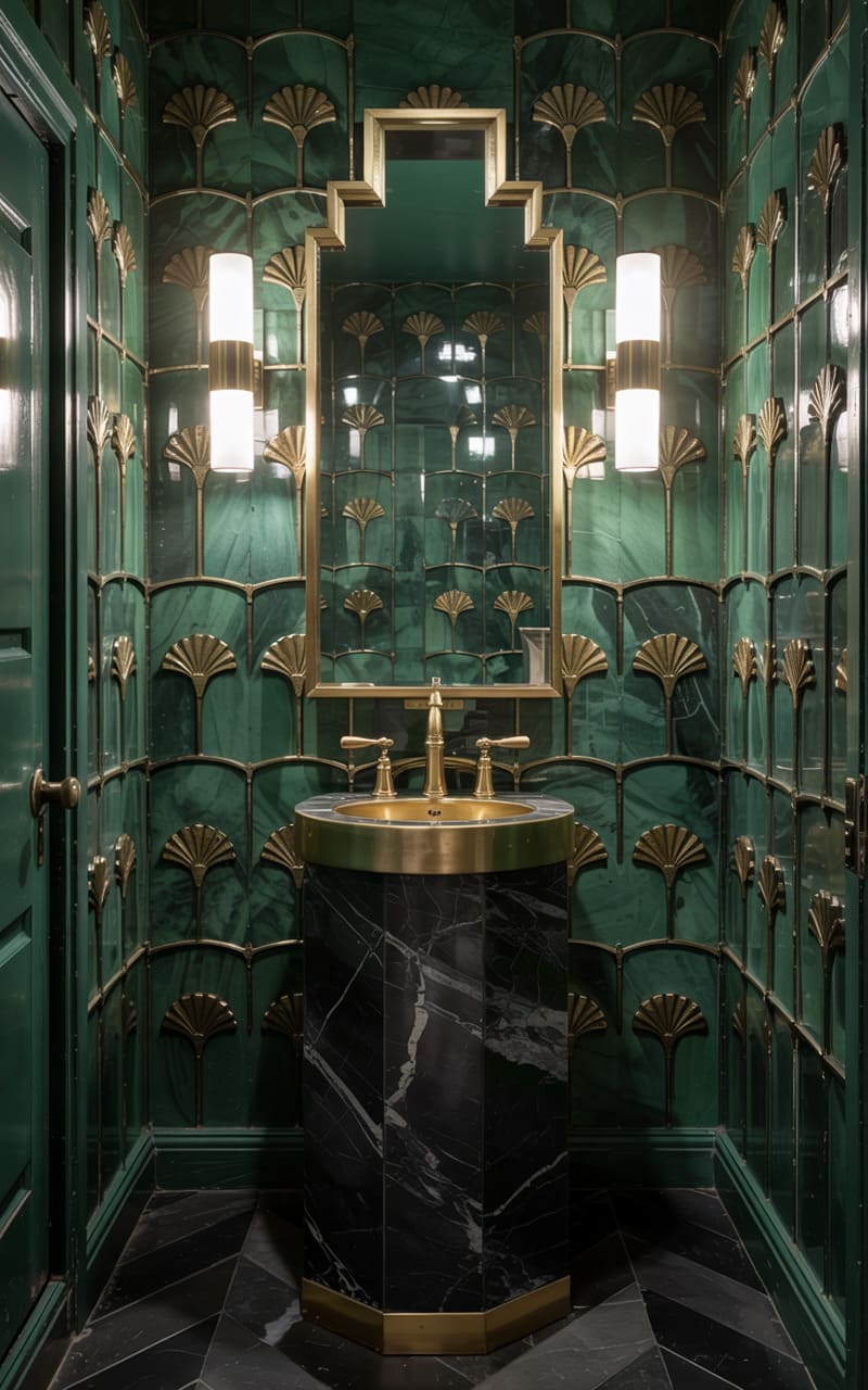 A jewel-box of emerald green and gold, this Art Deco powder room is a statement in opulence. Walls are clad in glossy, fan-patterned green tiles, accented by a geometric framework of gold trim that also forms the mirror frame. Two elegant, cylindrical wall sconces cast a warm glow. A black marble pedestal sink with dramatic white veining and gold fixtures makes a bold centerpiece. The dark, hexagonal tiled floor adds a final touch of moody sophistication to this dazzling and luxurious small space.