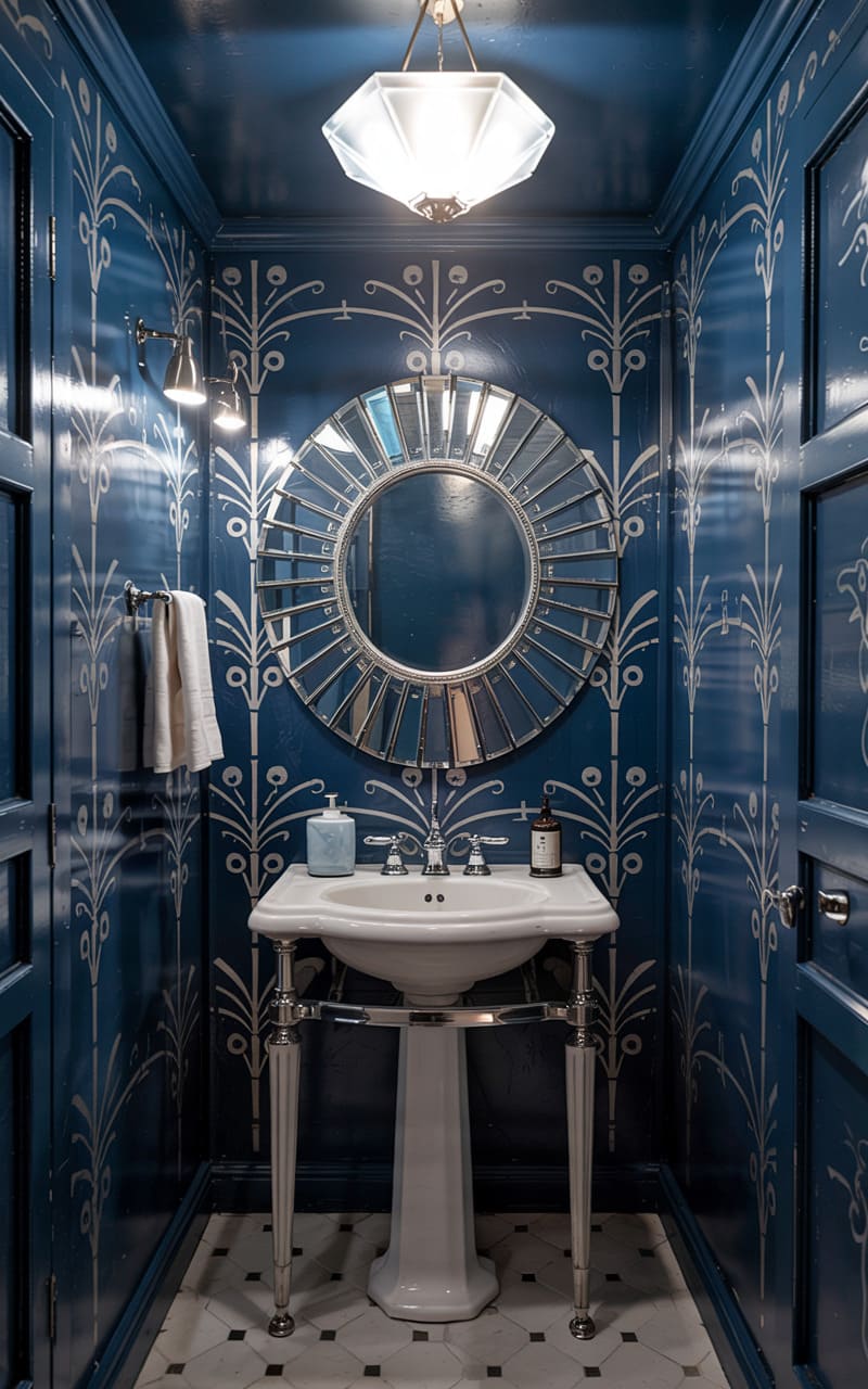 Classic elegance and bold patterns define this Art Deco powder room. High-gloss blue paneled walls feature a striking, white stylized botanical or feather motif. A traditional white pedestal sink with chrome legs provides a clean contrast. A circular mirror with a wide, bevel-edged frame hangs above, reflecting the room’s intricate details. A simple, classic ceiling fixture and a wall-mounted sconce provide illumination. The patterned black and white tiled floor adds another layer of timeless Deco charm.