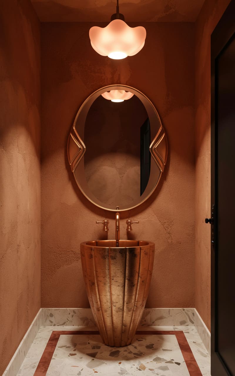 A charming, warm ambiance defines this Art Deco powder room. Terracotta-colored, textured plaster walls create an inviting, earthy backdrop. A unique, freestanding pedestal sink, crafted from hammered copper with a fluted design, makes a bold statement. A simple, oval mirror with a thin copper frame hangs above. A classic, shell-shaped frosted glass ceiling fixture casts a soft, diffused glow. The terrazzo floor, inlaid with a contrasting terracotta border, adds a final touch of rustic elegance.