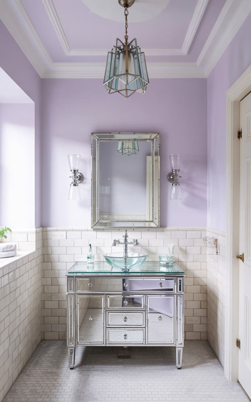 Soft lavender and shimmering silver create a serene and feminine atmosphere in this Art Deco bathroom. Pale lavender walls provide a calm backdrop for a stunning, mirrored vanity cabinet with intricate glass detailing and multiple drawers. A clear glass vessel sink sits atop the vanity. Elegant, torch-like wall sconces with frosted glass shades flank a bevel-edged mirror. A classic, caged crystal pendant light hangs from the ceiling. The small, white mosaic tile floor enhances the room’s bright and airy quality.
