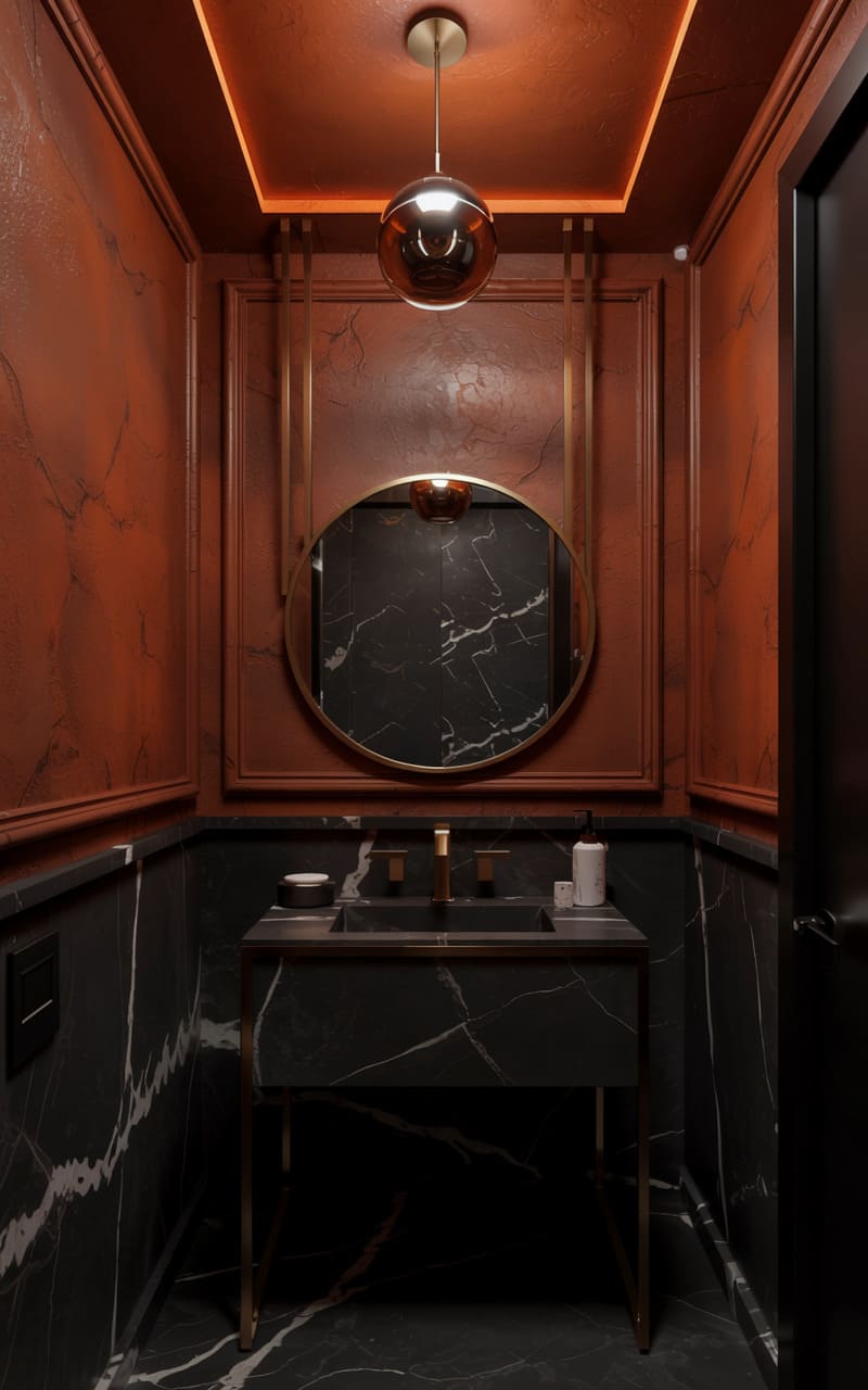179. Powder Room with Burnt Orange Ceiling and Nero Marquina Marble