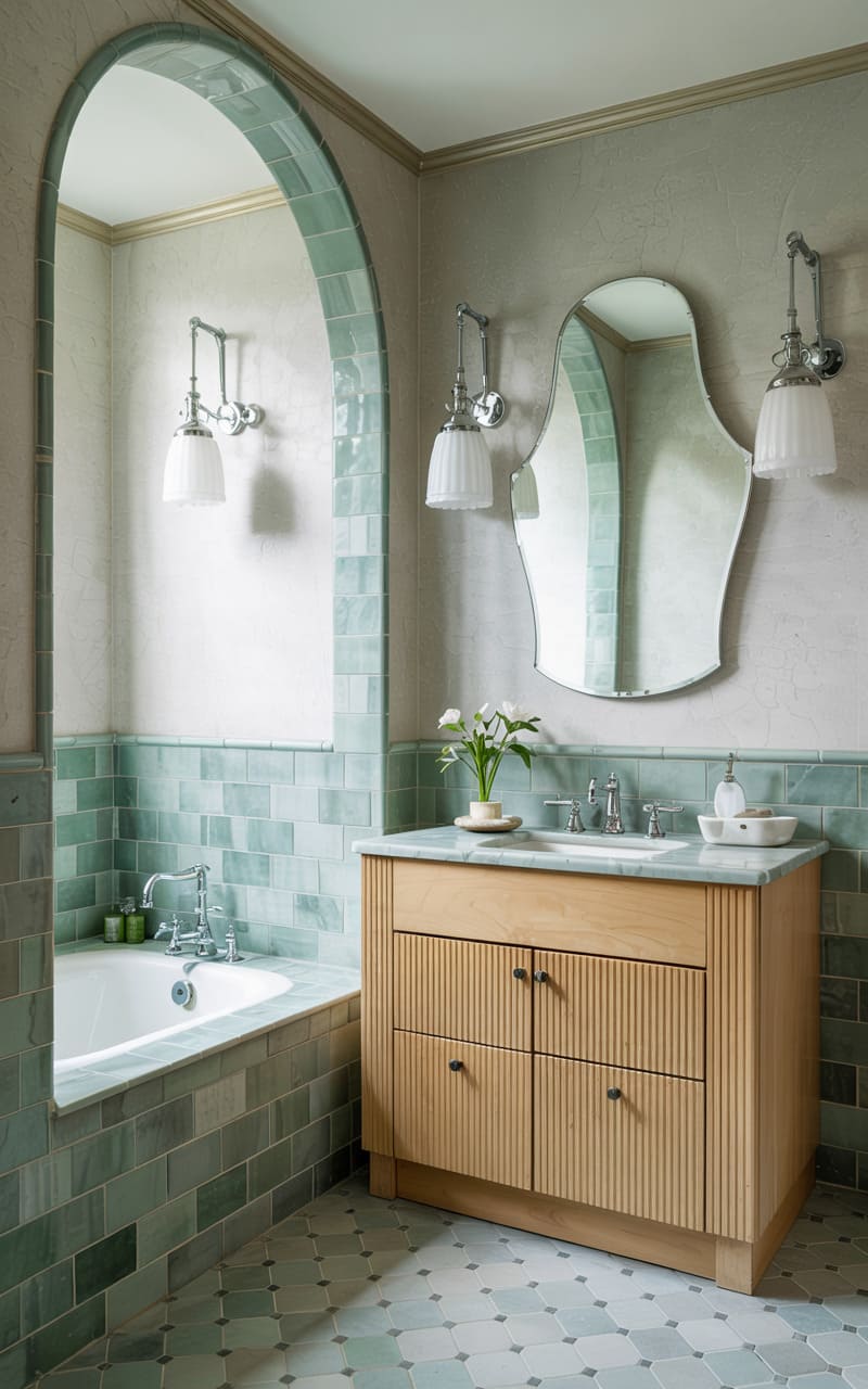 Soft, serene greens and natural wood create a tranquil, spa-like atmosphere in this Art Deco-inspired bathroom. Pale green, glossy subway tiles clad the walls and the built-in bathtub surround, with an arched alcove for the tub adding a touch of architectural charm. A light wood vanity with a fluted front and simple black hardware offers stylish storage. A uniquely shaped, frameless mirror hangs above the sink, flanked by elegant, shaded wall sconces. The hexagonal, muted green tile floor enhances the room’s calming and organic feel.