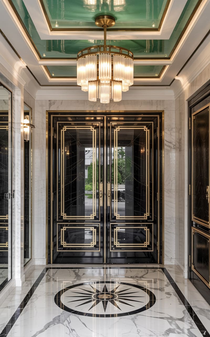 Grandeur and geometric precision command this opulent Art Deco entryway. Imposing black double doors, adorned with intricate gold geometric patterns and large, polished gold handles, make a striking statement. The surrounding walls are clad in white marble with dramatic grey veining. The floor is a masterpiece of black and white marble inlay, featuring a bold, radiating sunburst or compass rose design. A magnificent, multi-tiered crystal chandelier hangs from the high, coffered ceiling, its brilliance reflected in the polished surfaces and the teal-green lacquered ceiling accent.
