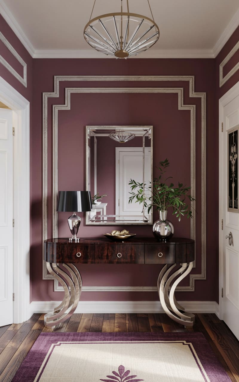 Understated elegance and a warm, inviting atmosphere characterize this Art Deco entryway. A sophisticated console table with a dark, polished wood top and gracefully curved, silver-toned legs makes a refined statement. It sits against a wall painted a rich, muted plum, framed by classic, stepped white molding. A rectangular mirror with a simple, wide frame reflects the light from a shaded table lamp. A light-colored rug with a subtle, dark border featuring a stylized botanical motif grounds the space, adding a touch of classic Deco patterning.