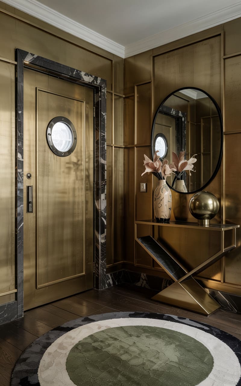 A moody, glamorous atmosphere pervades this Art Deco entryway, enveloped in shimmering, brushed gold paneling. A striking, circular black-framed mirror hangs above a sleek, minimalist console table with a dark top and an angular, X-shaped gold base. A vase with pale pink lilies adds a touch of organic softness. A round, patterned rug in shades of grey, black, and green lies on the dark wood floor. A substantial, gold-clad door with a circular porthole window completes this opulent and sophisticated first impression.