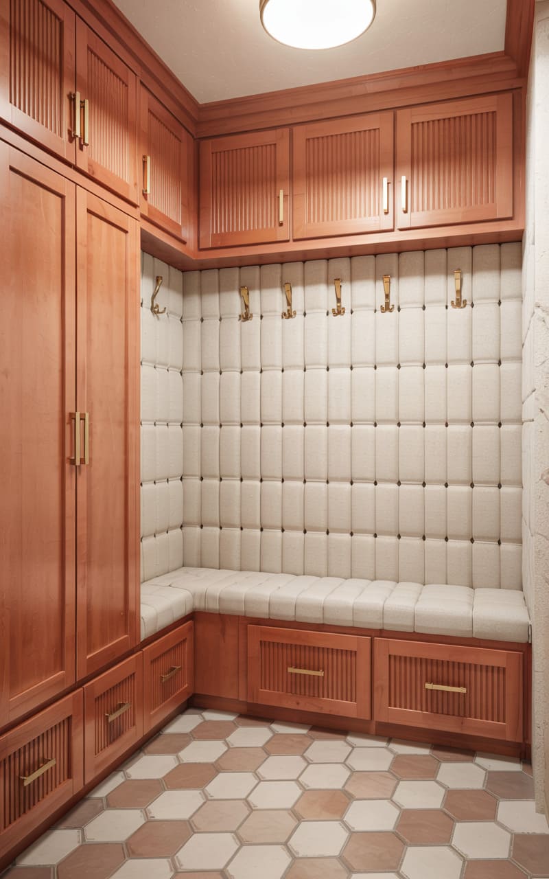 Warm wood and soft, neutral tones create a charming and functional Art Deco-inspired mudroom. Light brown, shaker-style cabinetry with simple brass hardware provides ample storage, including a built-in bench. The back wall and bench seat are upholstered in a quilted, button-tufted cream fabric, adding a touch of comfort and texture. Hexagonal terracotta and cream floor tiles create a delightful, honey-comb pattern. Simple brass coat hooks offer practical hanging space in this well-organized and inviting transitional area.