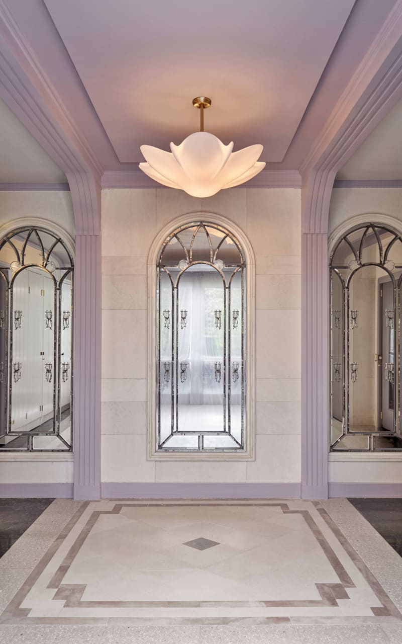 Ethereal beauty and soft, diffused light characterize this serene Art Deco hallway or transitional space. Three tall, arched niches dominate the scene, the central one framing a window dressed with sheer curtains, and the flanking ones featuring mirrored panels with intricate, wrought-iron-like geometric overlays. The walls are a light, textured stone, and the pilasters and architraves are painted a soft lavender. A magnificent, lotus-flower-shaped frosted glass ceiling fixture casts a gentle, ambient glow. The terrazzo floor features a classic, geometric inlay.