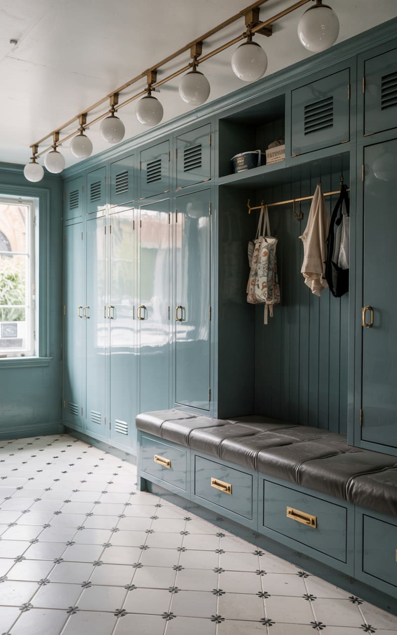 A bright and airy ambiance pervades this chic Art Deco mudroom or utility space. High-gloss, pale teal cabinetry with louvered door details and simple brass hardware provides ample storage, including a built-in bench with a plush, black leather cushion. A brass rod offers hanging space. A modern, multi-globe pendant light, suspended from a brass track, casts a warm glow. The floor features a classic, light-colored tile with a small, dark floral motif, enhancing the room’s fresh and stylish appeal.