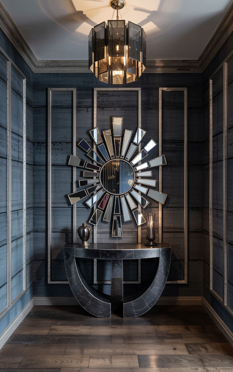 A moody and sophisticated niche is transformed into a statement of Art Deco glamour. Walls are clad in a textured, dark blue-grey wood-like paneling, framed by simple silver trim. A magnificent, multi-faceted sunburst mirror, its rays crafted from individual beveled glass segments, commands attention. It hangs above a sleek, semi-circular console table in a dark, brushed metallic finish. Two simple, metallic vases complete this dramatic and elegant vignette, perfect for a striking focal point in a hallway or entryway.