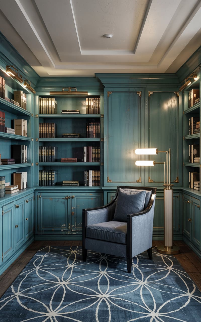 A serene and scholarly atmosphere envelops this Art Deco library, painted in a calming, aged teal hue. Built-in bookshelves, filled with leather-bound volumes, line the walls, featuring classic molding and gold accents. A comfortable armchair, upholstered in a dusty blue velvet with a dark wood frame, invites relaxation and literary contemplation. A tall, minimalist floor lamp with two cylindrical shades provides focused illumination. A large, patterned rug in shades of blue with an interlocking circular motif adds a touch of classic Deco geometry.