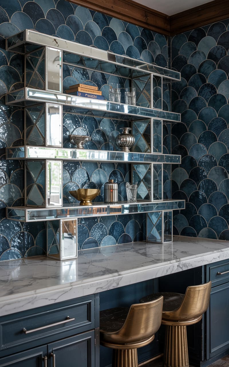 A captivating display of texture and reflection, this Art Deco bar area features a stunning backsplash of dimensional, fan-shaped tiles in varying shades of deep blue, creating a mesmerizing, fish-scale-like effect. Open shelving, constructed from mirrored panels, showcases a collection of glassware and decorative objects, their reflections adding depth and sparkle. A white marble countertop provides a luxurious surface. Two sculptural, gold-toned bar stools offer stylish seating. This space is a masterful blend of artistic detail and sophisticated glamour.
