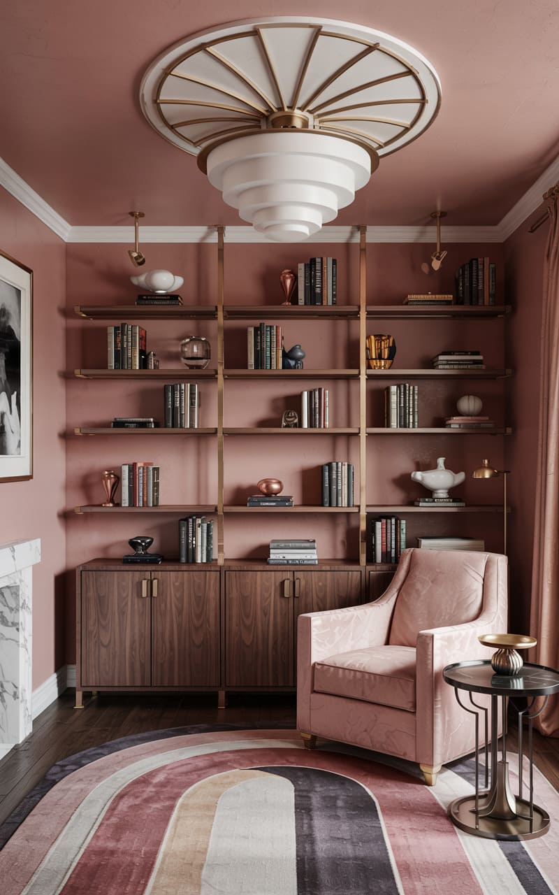 Soft, warm tones and classic Art Deco forms create a serene and studious atmosphere in this inviting reading room or library. Walls are painted a dusty rose hue, providing a gentle backdrop for tall, open shelving units in a warm brass finish, displaying books and decorative objects. A comfortable armchair, upholstered in a pale pink patterned fabric, is paired with a small, dark marble-topped side table. A magnificent, tiered, white frosted glass ceiling fixture, reminiscent of a classic Deco ziggurat, casts a soft, diffused glow. A circular rug with a radiating, rainbow-like pattern adds a touch of playful color.