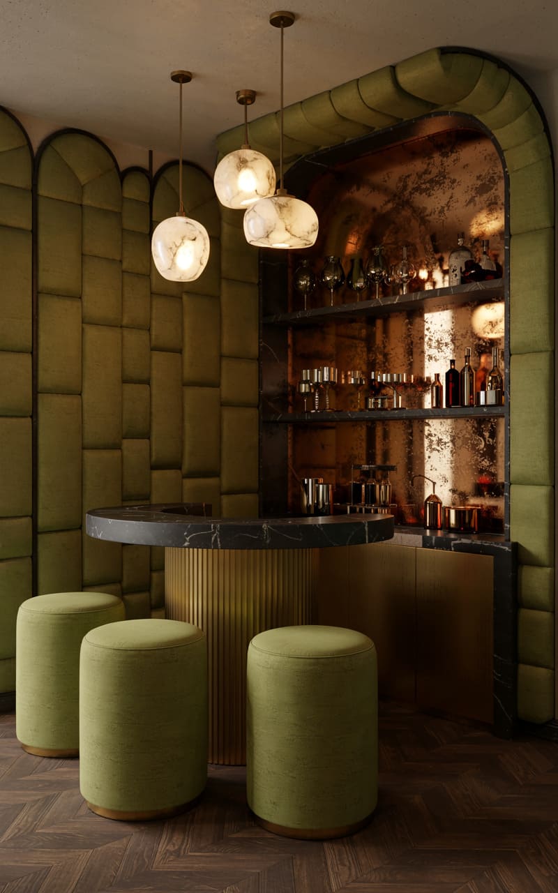 A cozy, clandestine atmosphere envelops this intimate Art Deco bar nook. Walls are upholstered in channel-tufted, olive green velvet panels, creating a plush, enveloping feel. A small, circular bar with a dark marble top and a ribbed, gold-toned base offers an inviting spot for a drink. Three simple, cylindrical bar stools in matching olive green provide seating. An arched, recessed shelving unit behind the bar, lined with antiqued mirror, displays a collection of spirits, its warm, integrated lighting casting a soft glow.