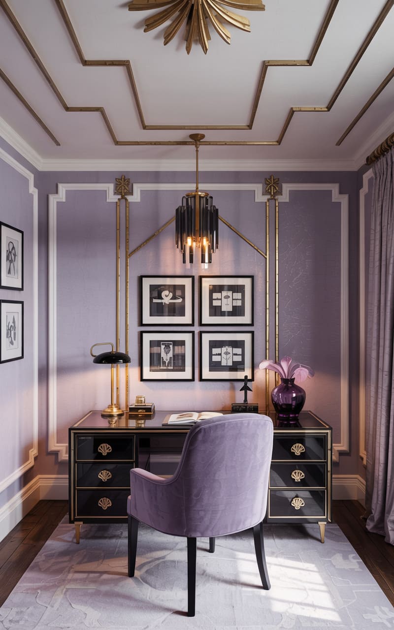 A feminine and glamorous atmosphere defines this Art Deco home office. Walls are painted a soft lavender, featuring classic panel molding outlined in delicate gold trim, with stylized, star-like gold embellishments. A sleek, black lacquered desk with scalloped drawer fronts and gold hardware offers an elegant workspace, complemented by a chair upholstered in lavender velvet. A classic, tiered crystal and black metal chandelier hangs from the ceiling. Four framed, black and white fashion illustrations add a touch of artistic flair.