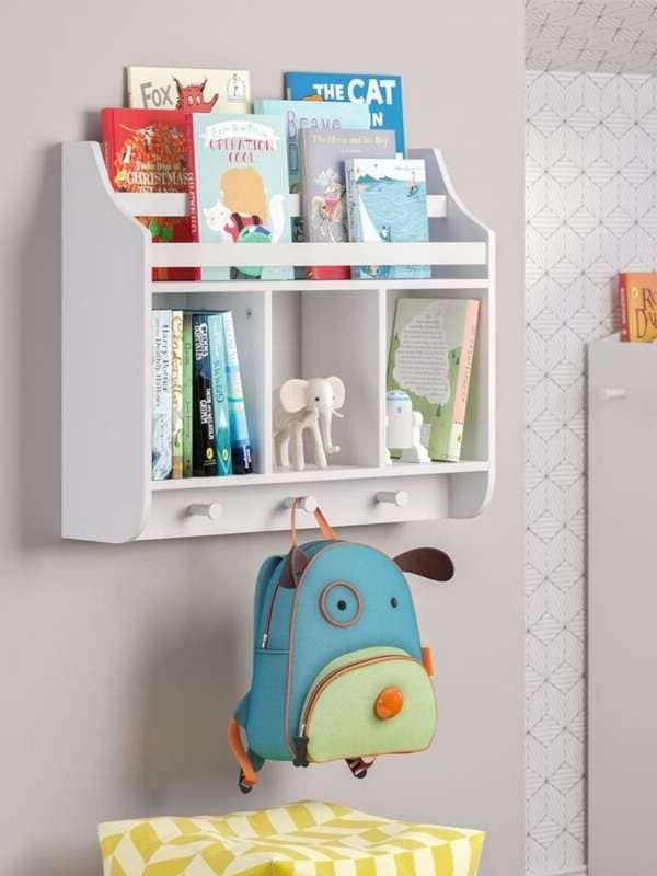 Small children need to stay organized too. Notice the style of this kid-friendly holder designed for wall mounting. It allows for easy storage of many different items on its shelves while providing hooks to place little backpacks used by preschoolers. This is quite the functional storage piece when you also take into account the dedicated rack for children’s books.