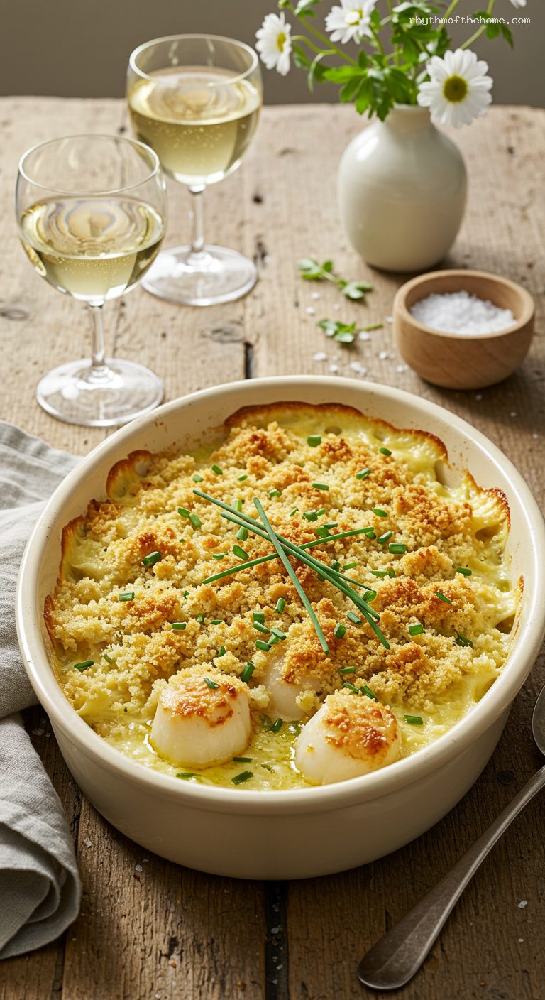 Lay the scallops in the prepared dish in a single snug layer. Pour the white wine around the scallops so it pools in the bottom of the dish; avoid pouring directly over the tops to keep the crumbs crisp.