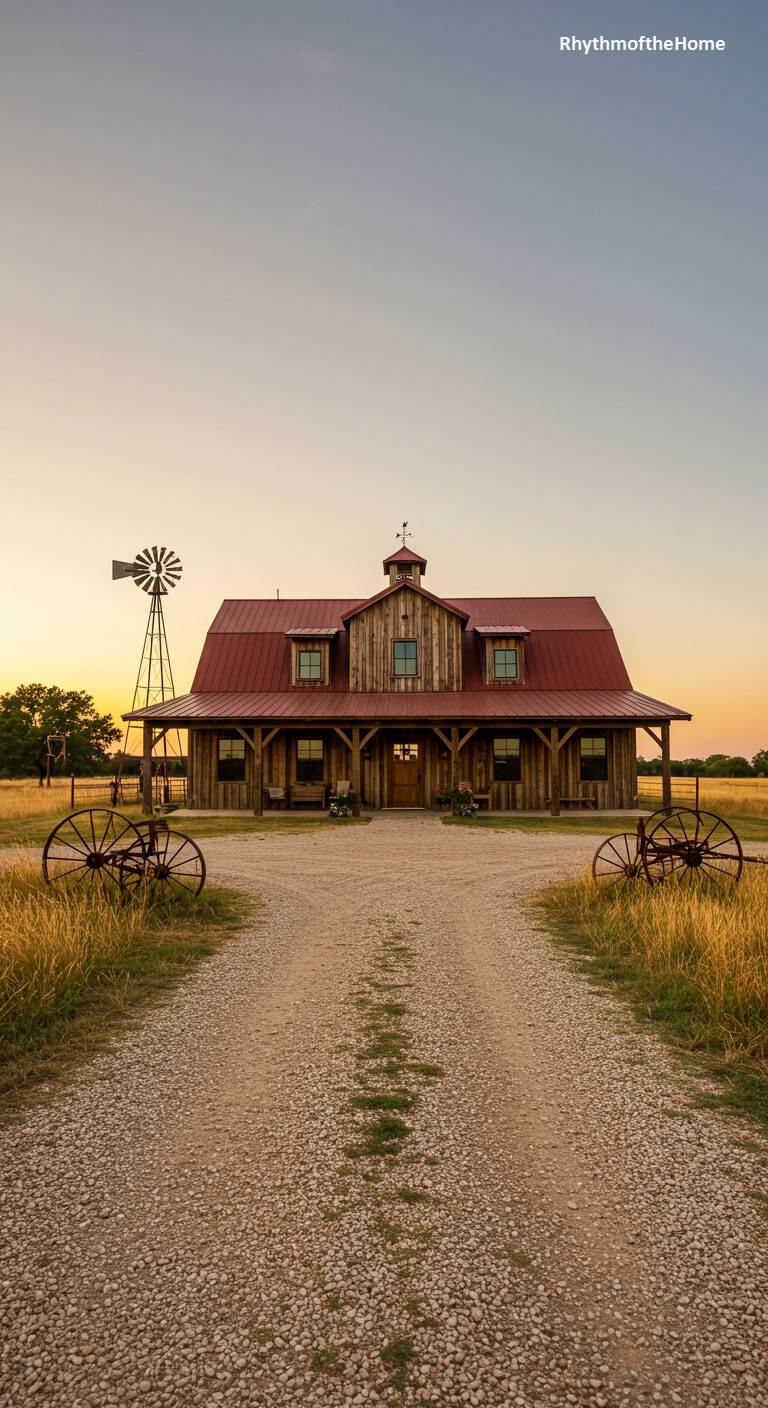 This quintessential barndominium stands as a proud silhouette against a warm, fading sunset. Its weathered wood siding and vibrant red metal roof evoke a sense of timeless rural charm. A symmetrical design is accentuated by a central cupola and dormer windows. The gravel driveway forks around two antique wagon wheels, leading the eye toward the welcoming front porch. To the left, a classic windmill completes the picturesque scene, grounding this beautiful home in its pastoral landscape. The golden hour light bathes the entire property in a soft glow, creating an atmosphere of peace and nostalgic comfort.