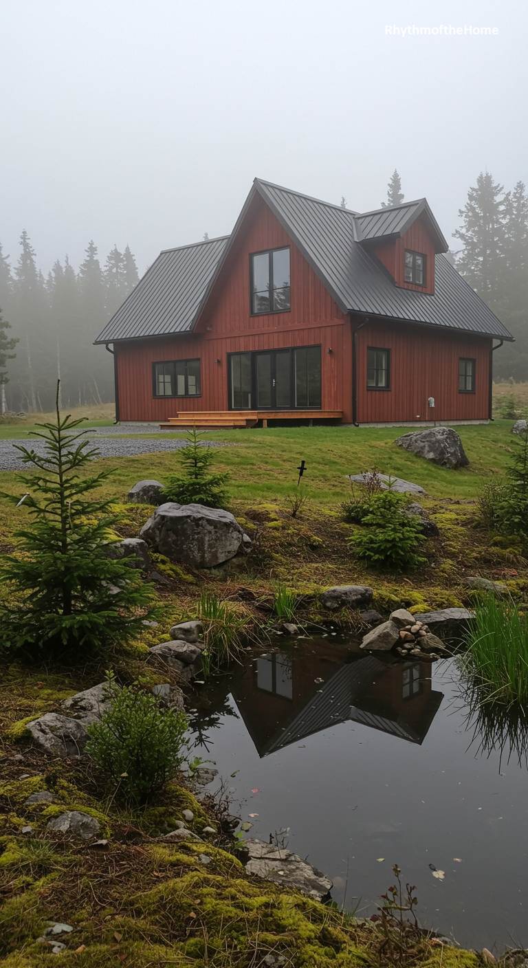 This barndominium is a tranquil haven of modern design set within a serene, misty landscape. The rich, rust-colored siding and sleek black metal roof create a warm contrast against the cool tones of the foggy morning. Large, dark-framed windows are designed to maximize the view of the surrounding nature. The home is perched on a gentle slope overlooking a small, still pond, its reflection creating a perfect mirror image on the water’s surface. This property is a peaceful retreat, where minimalist architecture and the quiet beauty of a misty forest come together in perfect harmony.