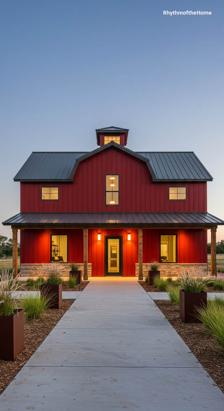This barndominium offers a vibrant and contemporary take on the classic red barn. The rich red siding is paired with a sleek dark metal roof and is set upon a light-colored stone foundation, creating a modern and stylish look. At dusk, the home glows from within, with warm light spilling from the windows and highlighting the clean lines of the concrete walkway. The landscaping is simple and modern, featuring ornamental grasses in rusted steel planters. This home successfully marries a traditional color with clean, contemporary design for a truly stunning result.