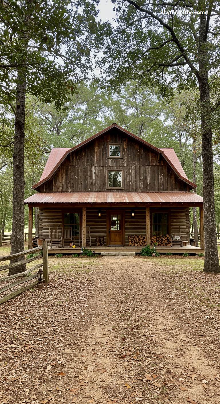 Deep within a tranquil woodland setting, this barndominium offers a cozy and authentic rustic experience. The structure beautifully combines traditional log cabin construction on the lower level with vertical wood siding on the upper story. A welcoming covered porch, perfect for rocking chairs and stacks of firewood, runs the length of the home. The red metal roof adds a classic touch of color against the natural wood tones. A simple dirt and leaf-covered path leads to the front door, enhancing the feeling of being completely immersed in the peaceful embrace of the forest.