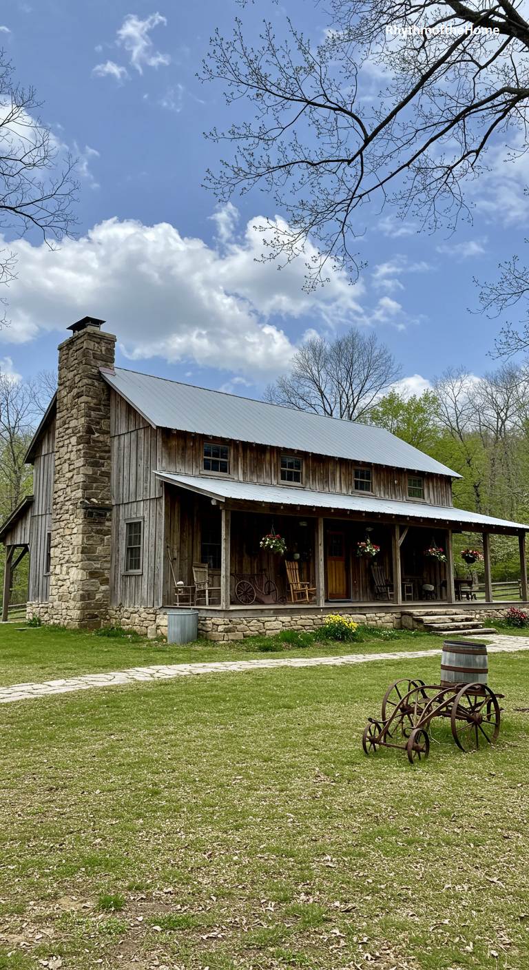 This charming barndominium showcases a beautiful fusion of stone and wood, creating a timeless and sturdy aesthetic. The weathered, light-colored wood siding gives the home a rustic, aged feel, which is powerfully anchored by a massive stone chimney on the left side. A full-length covered porch offers a perfect spot to enjoy the surrounding green landscape. The foundation of the home also features stonework, tying the design together. An old, rustic farm implement sits on the lawn as a decorative piece, adding a final touch of agricultural character to this peaceful country home.