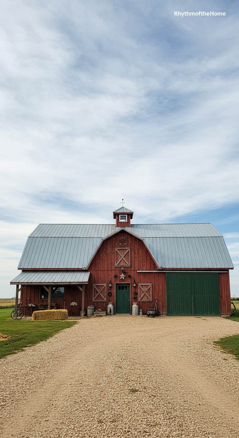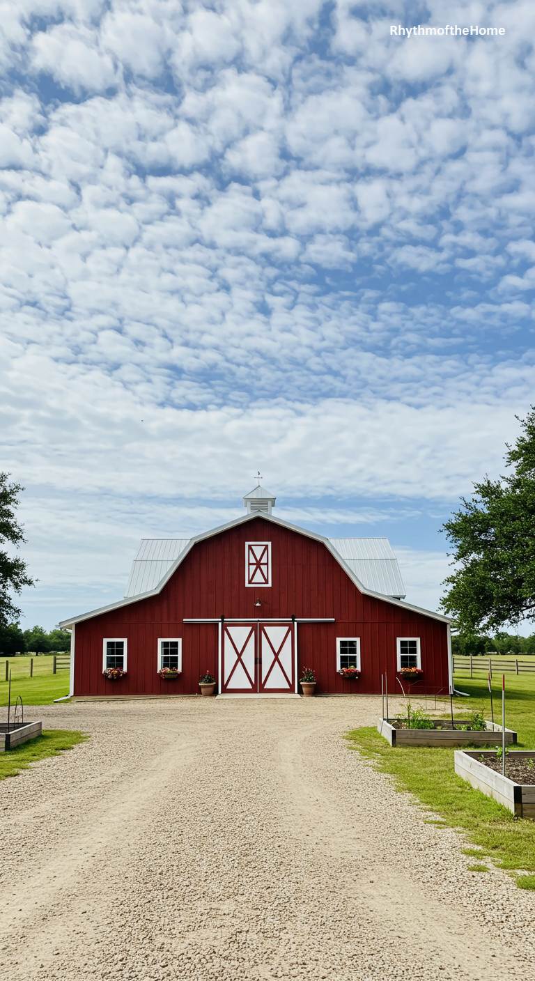 This barndominium is the epitome of classic American barn style. It features a traditional gambrel roof with a silver metal finish, set atop a vibrant red structure. The white trim on the windows and the large, white crossbuck barn doors provide a crisp and iconic contrast. A simple gravel driveway leads to the front, flanked by neat raised garden beds. This home is a timeless classic, evoking a sense of nostalgia, simplicity, and the enduring appeal of the American countryside under a vast blue sky dotted with fluffy white clouds.