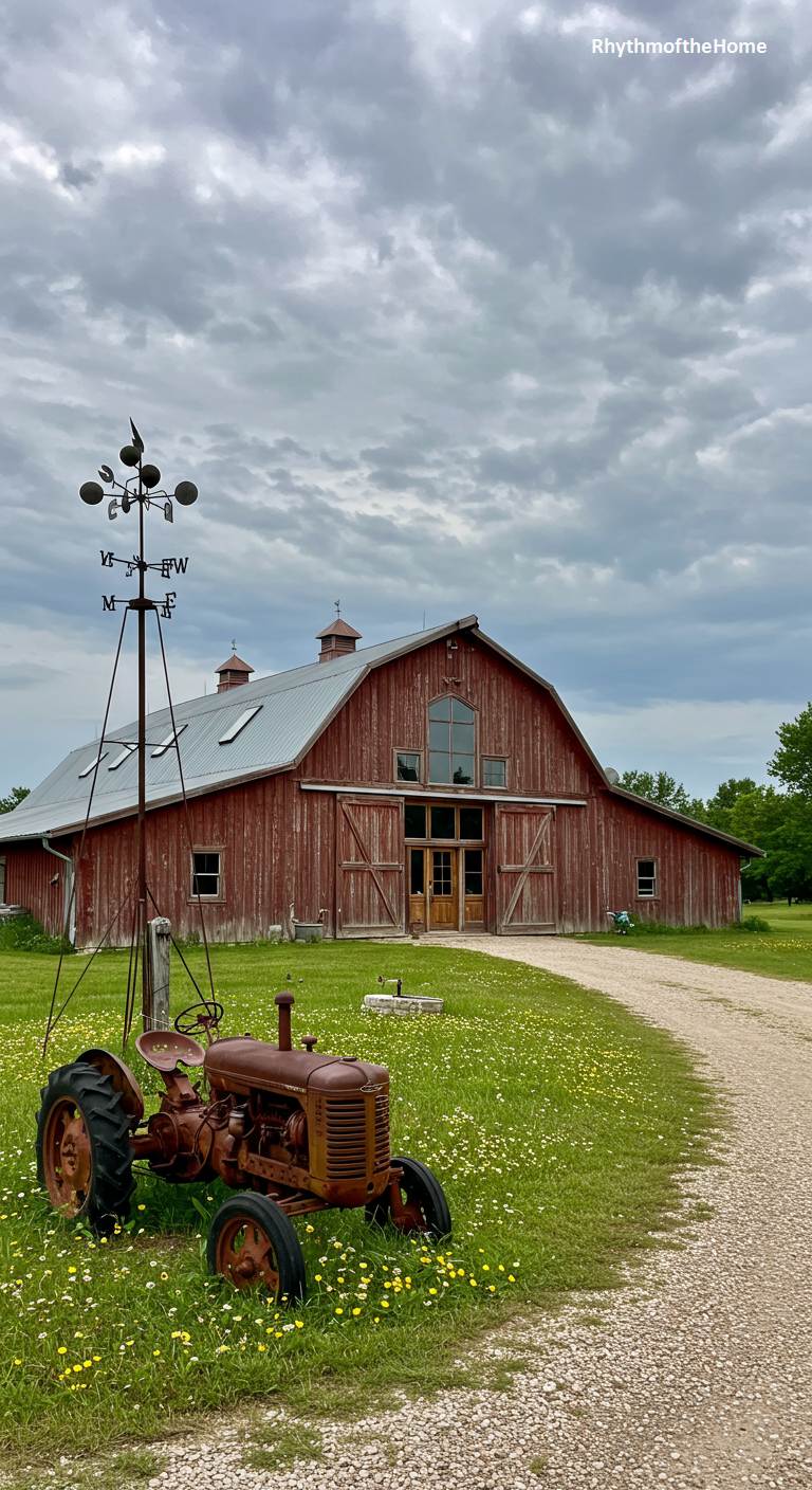 This property captures the nostalgic essence of a vintage farmstead. The centerpiece is a classic red barndominium with a gambrel roof and large, barn-style doors. A rusty, antique tractor sits in the foreground, nestled in a field of yellow wildflowers, serving as a charming and authentic piece of decor. A simple weathervane stands nearby, pointing to the sky. The gravel driveway curves gently towards the entrance, inviting you into a scene that feels like a beautiful step back in time, celebrating the simple, hardworking spirit of rural America.