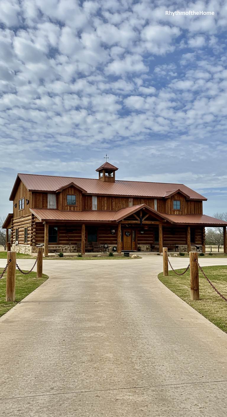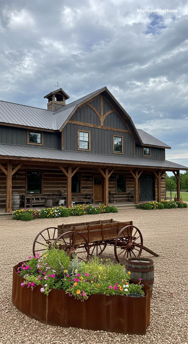 This charming barndominium is a vibrant celebration of color and life. While the structure itself is a handsome log and timber frame building with a dark roof, it’s the landscaping that steals the show. A large, rustic metal planter in the foreground overflows with a cheerful mix of pink, yellow, and purple flowers. Antique wooden barrels and a rustic wagon add layers of country charm. The wide, welcoming porch is the perfect stage for enjoying the beautiful garden and the peaceful, open surroundings of this delightful and lovingly tended home.
