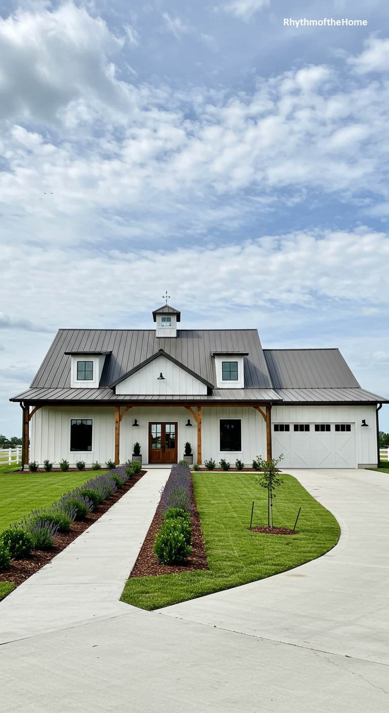 Exuding contemporary elegance, this barndominium showcases the best of the modern farmhouse aesthetic. The structure features crisp white board-and-batten siding contrasted sharply with a dark standing-seam metal roof and black-framed windows. Natural wood tones on the support beams and double front doors add warmth and a rustic touch. The landscaping is immaculate, with a pristine green lawn and a straight concrete path flanked by rows of purple lavender. An integrated two-car garage provides modern convenience, making this home a perfect blend of sophisticated design and functional country living under a vast, cloud-dappled sky.