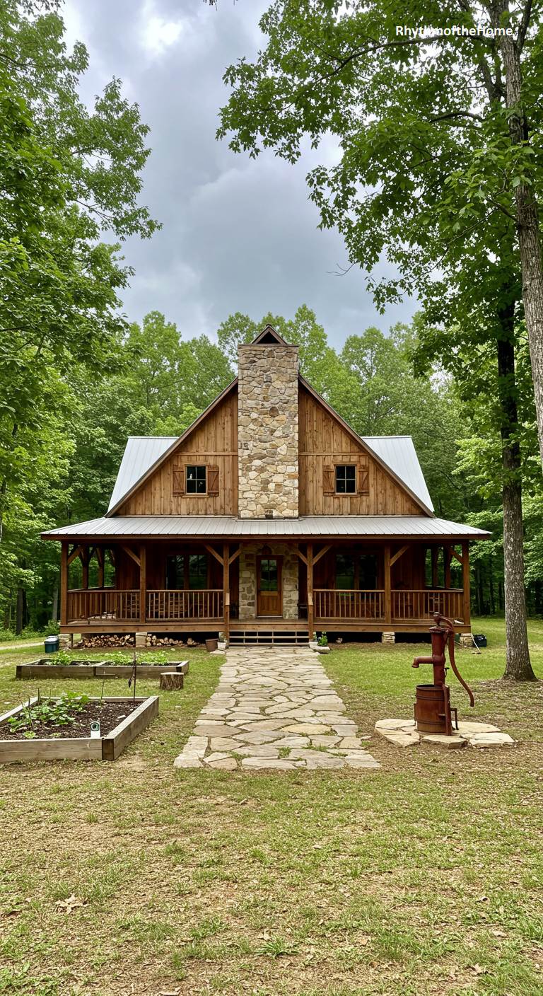 Tucked away in a dense grove of trees, this barndominium is the epitome of a cozy woodland cabin. Its natural wood siding and prominent stone chimney blend perfectly with the surrounding forest. A full-width covered porch provides a sheltered space to enjoy the sights and sounds of nature. Raised garden beds and a classic red water pump in the foreground add to the rustic, self-sufficient charm. A simple flagstone path guides visitors to the front door, completing the picture of a peaceful, secluded retreat hidden in the heart of the woods.